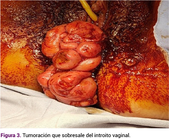 Se citó a las tres semanas para revisión y valoración de la vía de finalización del embarazo y para el tratamiento quirúrgico de la tumoración vaginal. El rastreo ultrasonográfico fetal no reportó alteraciones, ni en el líquido amniótico ni la placenta. A la exploración física se observó un crecimiento importante de la tumoración vaginal (12 cm) que ocluía por completo la vía vaginal, con áreas de necrosis y sangrado escaso. Figura 2