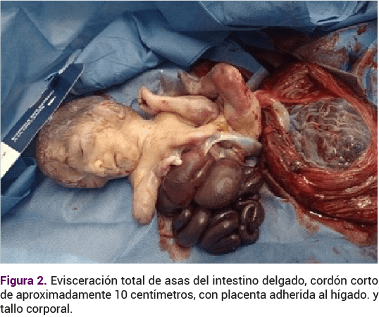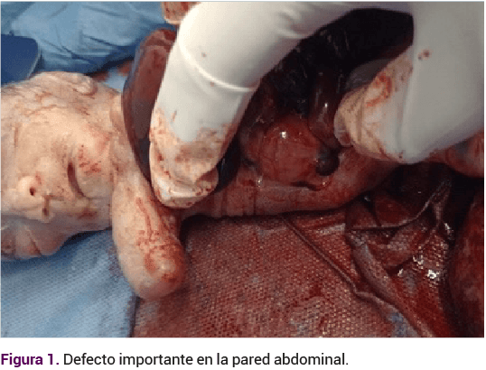 El nacimiento del recién nacido fue por parto, a las 22 semanas de gestación, con ruidos cardiacos audibles de bajo tono, con defecto importante en la pared abdominal (Figura 1).