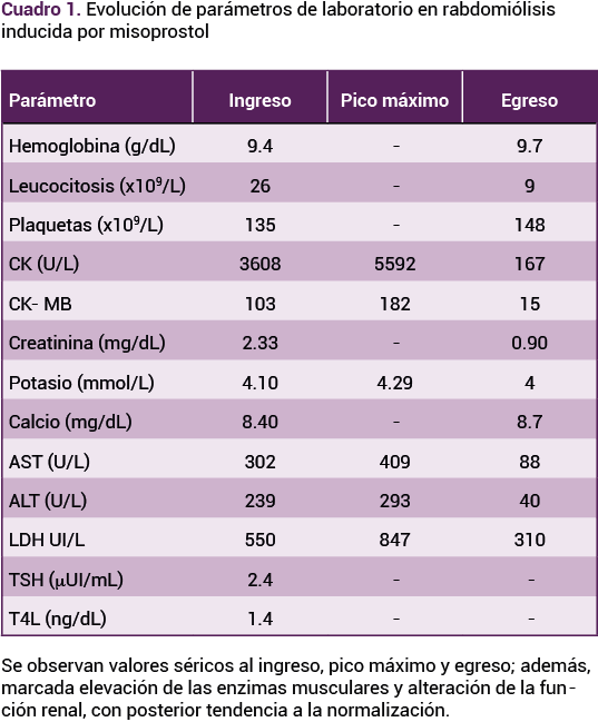 Se continuó con hidratación y, luego de cinco horas con antipiréticos y medidas físicas, se logró mantener la temperatura en 37 °C y hemodinámicamente estable. Durante su estancia permaneció con hidratación, con un cálculo de diuresis mayor de 200 cc por hora y dieta con abundantes líquidos administrados por vía oral. Debido al alza de la creatincinasa, el descarte de otras posibles afecciones y los síntomas, se estableció el diagnóstico de rabdomiólisis secundaria a una reacción inducida por misoprostol. Fue egresada sin complicaciones y en seguimiento ambulatorio.