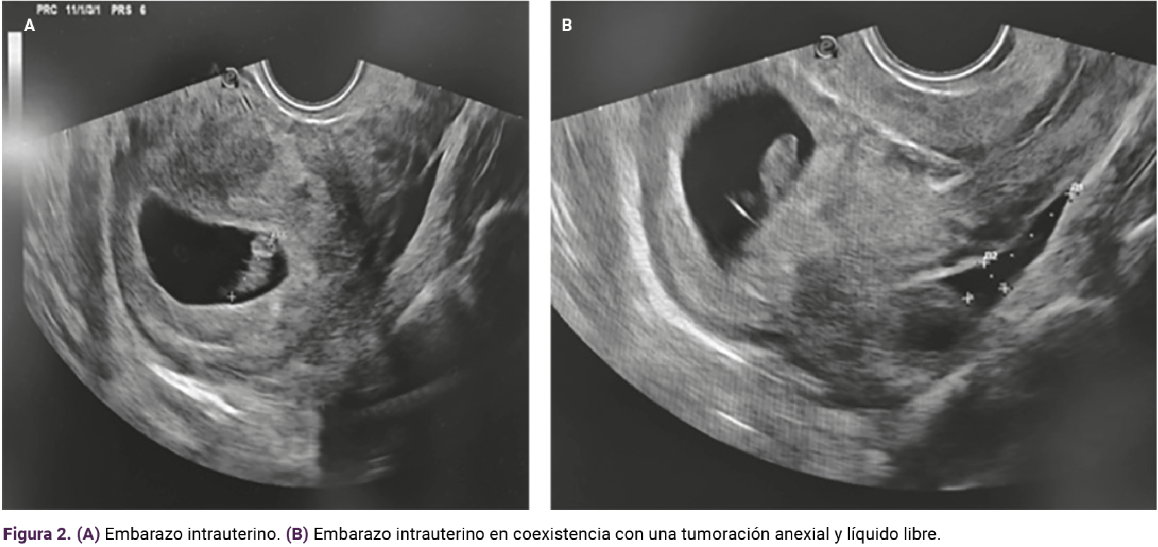 Debido a los hallazgos en la exploración física se decidió la práctica de un ultrasonido transvaginal que puso de manifiesto la existencia de una masa anexial derecha de 3 x 2 cm, con un saco con un embrión con latido cardiaco y longitud cráneo-caudal de 13.3 mm, correspondiente a siete semanas y cuatro días (Figura 1), en simultaneidad con el embarazo intrauterino. Figura 2. A y B