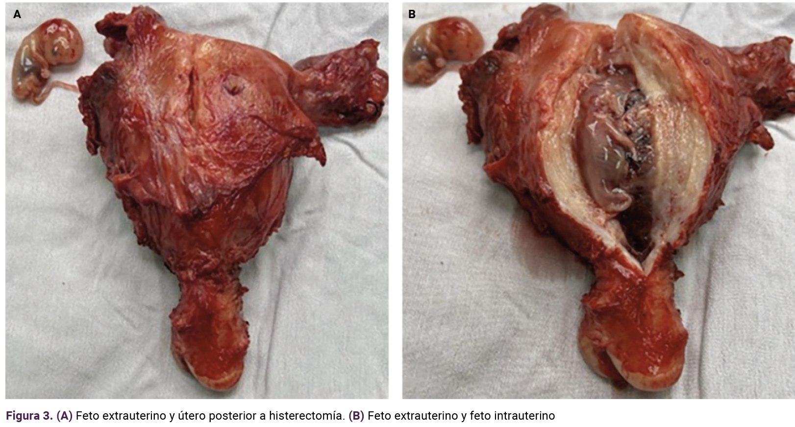 La laparotomía de urgencia evidenció un hemoperitoneo de aproximadamente 1500 cc. Se observó que un embarazo se encontraba en el segmento intersticial de la trompa de Falopio donde, desafortunadamente, evolucionó hasta destruir la integridad del útero junto con la trompa de Falopio izquierda. Debido a la pérdida de sangre se decidió la histerectomía con salpingooforectomía izquierda (Figura 3), que transcurrió sin complicaciones. Su evolución fue satisfactoria y se dio de alta al tercer día después de la cirugía.