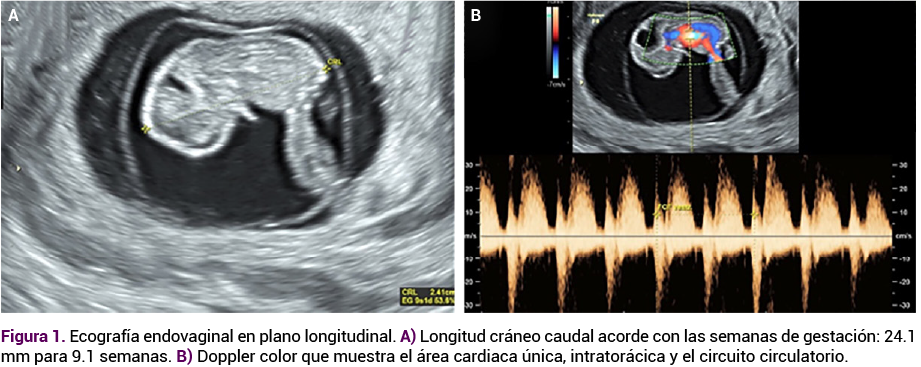 Acudió a consulta a las 9 semanas de embarazo para seguimiento. El ultrasonido del primer trimestre, con equipo de alta definición Voluson P8, reportó útero en anteverso-flexión, miometrio homogéneo y bordes regulares. En su interior, en localización fúndica, se observó saco gestacional de bordes regulares con un embrión de 24.1 mm de longitud craneocaudal (9.1 semanas) y frecuencia cardiaca de 175 latidos por minuto (Figura 1 A y B), con malformación craneal.