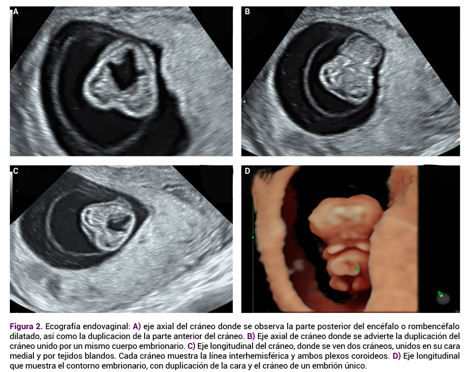 La reacción corial era adecuada, sin desprendimientos ni hematomas, con cuello uterino cerrado. Impresión diagnóstica: embarazo de 9.1 semanas con malformación grave en el espacio craneofacial de aspecto bífido, compatible con diprosopia, y anomalías en la fosa posterior de aspecto quístico (Figura 2 A-D).