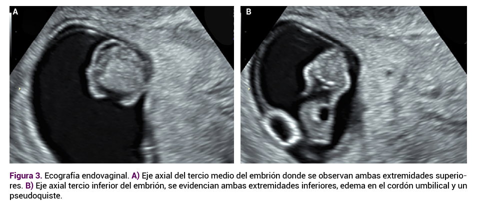 Las extremidades superiores e inferiores se apreciaron sin anormalidades aparentes. Se observó un quiste de cordón umbilical, probable onfalocele (Figura 3 A y B). Se explicó a la paciente el mal pronóstico fetal a corto plazo y la necesidad de interrumpir el embarazo. La paciente no aceptó la realización de estudio genético.