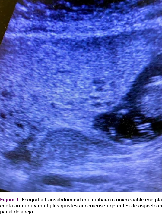 Paciente de 30 años, con antecedente de dos embarazos y una cesárea en curso de las 15 semanas de gestación, que acudió a urgencias debido a un dolor abdominal epigástrico, con náuseas y vómitos de tres días de evolución; sin control prenatal, obesidad mórbida, peso de 110 kg y altura de 1.57 m, con fondo uterino por encima de la sínfisis del pubis. La ecografía transabdominal confirmó un embarazo único viable, compatible con 14.5 semanas de gestación mediante biometría fetal, con latido fetal audible y una placenta anterior agrandada, con múltiples quistes anecoicos, de aspecto en panal de abeja y oligohidramnios. Además, múltiples quistes tecaluteínicos sugerentes de enfermedad trofoblástica compatible con mola hidatiforme parcial.