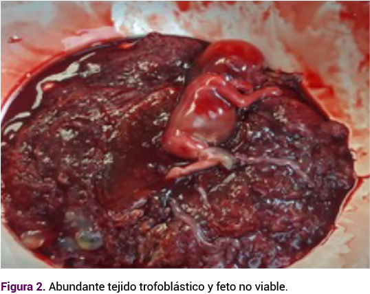 Doce horas posteriores a la maduración, debido al estado de gravedad y modificaciones cervicales no favorables, se procedió a la laparotomía exploradora en la que se encontró abundante ascitis de alrededor de 500 cc, petequias en el peritoneo parietal y en el hígado, además del útero aumentado de tamaño para las semanas de gestación. Debido a la paridad no satisfecha se optó por la histerotomía evacuadora, con obtención de abundante tejido trofoblástico y un feto intrauterino no vivo.