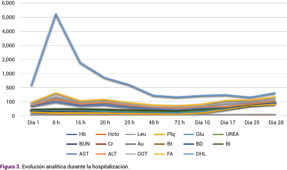 Los análisis de laboratorio reportaron: hematocrito: 49.2% ALT: 262 U/L; AST: 625 U/L; LDH: 1251 U/L; plaquetas: 90,000/μL; creatinina: 1.7 mg/dL; bilirrubina total: 0.9 mg/dL; bilirrubina directa: 0.5 mg/dL; bilirrubina indirecta: 0.4 mg/dL; proteínas en análisis de orina: 500 mg/dL; β-hCG: 624.660 mUI/mL. Con estos reportes se confirmó la enfermedad trofoblástica gestacional y el síndrome HELLP que evolucionó a las 16 horas de su internamiento con los siguientes valores de control bioquímico: ALT: 512 U/L; AST: 2033 U/L; LDH: 5637 U/L; plaquetas: 90,000/μL; creatinina: 1.7 mg/dL; bilirrubina total: 6.4 mg/dL; bilirrubina indirecta: 4.1 mg/dL; bilirrubina directa: 2.3 mg/dL; hipertransaminasemia e hiperbilirrubinemia a expensas de la bilirrubina indirecta que evolucionó a insuficiencia hepática aguda, clasificación III.