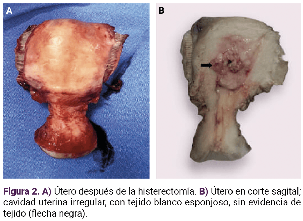 El estudio histopatológico confirmó el diagnóstico de embarazo ectópico intersticial roto. Figura 1