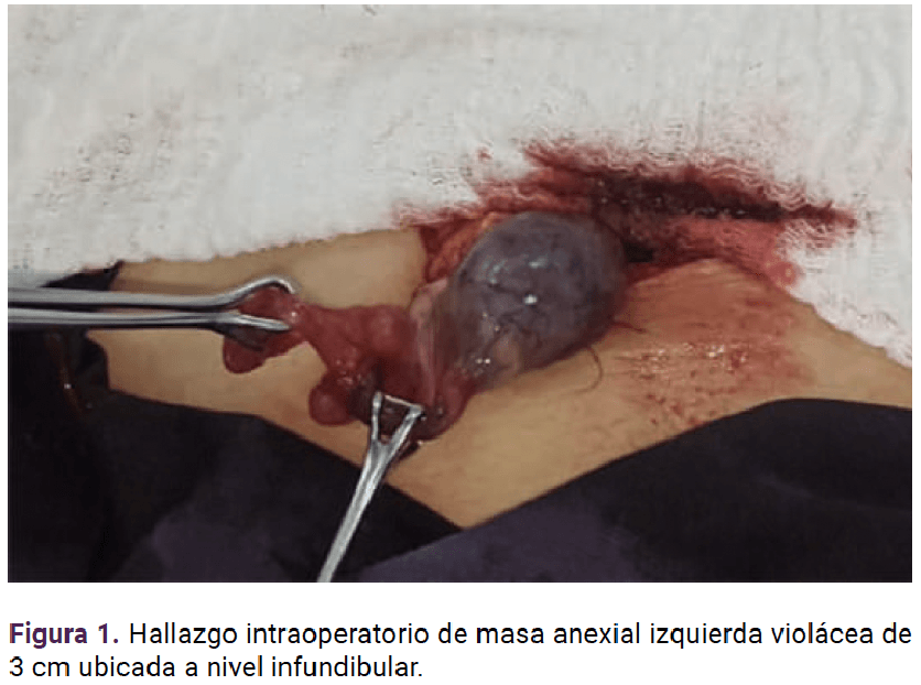 Posterior a una hora del tratamiento establecido, la paciente se encontró álgida, con signos vitales de: tensión arterial 95-64 mmHg, media de 68 mmHg, frecuencia cardiaca 115 lpm, frecuencia respiratoria: 19 rpm, temperatura de 36.3 °C, saturación de oxígeno de 95% con FiO 28% con MEOWS de 7 puntos y abdomen con signos de irritación peritoneal. La ecografía transvaginal de urgencia evidenció el embarazo intrauterino, con embrión único de 12 mm, con embriocardia positiva y lesión paraanexial izquierda, de ecos mixtos, asociada con abundante líquido libre en la cavidad de 75 x 69 mm. Se procedió a la laparotomía exploradora de urgencia, con hallazgos de masa violácea en el infundíbulo de la trompa uterina izquierda, de aproximadamente 3 cm (Figura 1) asociada con 1000 cc de hemoperitoneo compatible con embarazo heterotópico y embarazo ectópico roto.