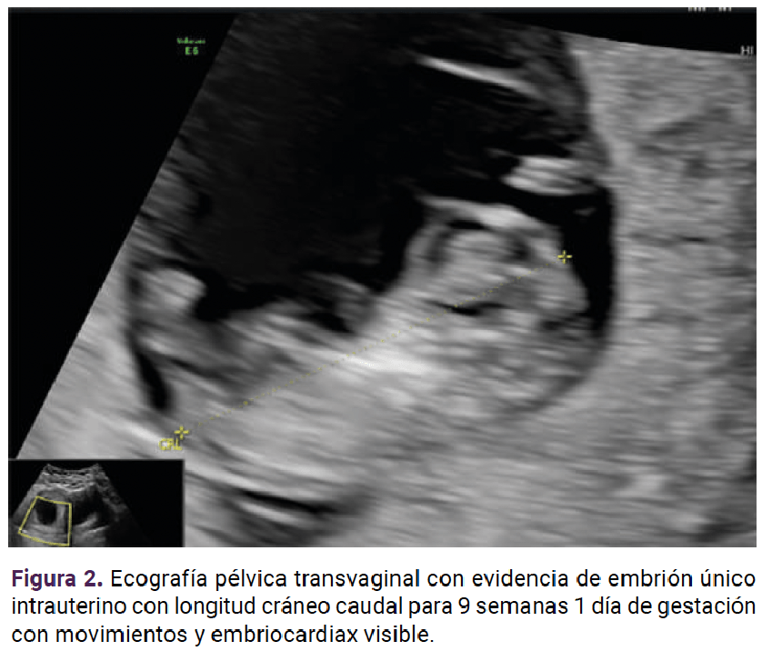 Paciente de 31 años, con antecedente de tres embarazos y dos partos, fabricante de calzado, sin otros datos médicos relevantes. Ingresó al servicio de Obstetricia del Hospital Universitario Clínica San Rafael con 9.2 semanas de embarazo, determinadas por la fecha de la última menstruación, con un cuadro clínico de tres horas de evolución de dolor abdominal localizado en el hipogastrio, tipo cólico, de intensidad 6-10, no irradiado y asociado con náuseas, episodios eméticos y disuria, sin disminución con la administración oral de butil bromuro de hioscina.