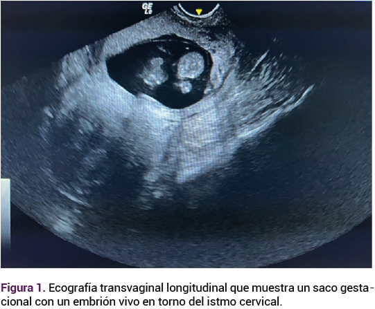 Paciente de 40 años con antecedentes de menarquia a los 15 años, 4 embarazos, 1 parto eutócico y 2 cesáreas electivas; fecha de la última menstruación no confiable, previo esquema de anticoncepción hormonal inyectable. Acudió a consulta a solicitar la interrupción legal del embarazo. En la valoración ecográfica transvaginal se observó un saco gestacional implantado a nivel ístmico-cervical, con feto vivo de 12 semanas de gestación (longitud cefalocaudal de 61 mm), con frecuencia cardiaca fetal de 145 lpm. Ante esos hallazgos se solicitó la interconsulta con los especialistas en medicina materno-fetal quienes corroboraron el diagnóstico de embarazo ectópico ístmico-cervical (Figura 1).