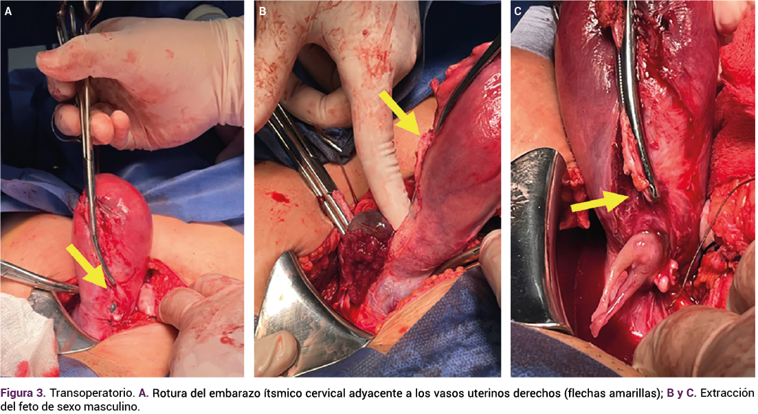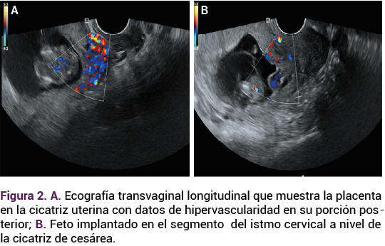 El fondo uterino se encontró vacío y al feto en el segmento inferior, la placenta cubría el orificio cervical interno, con vasculatura anormal hacia el segmento, con impresión diagnóstica de embarazo ectópico ístmico-cervical (Figuras 2A y 2B).