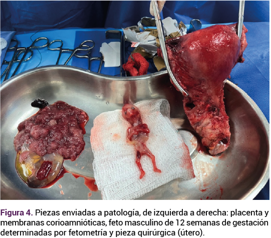 Luego de confirmar el diagnóstico de embarazo ectópico implantado en la cicatriz de cesárea se discutieron las opciones de tratamiento con la paciente y se le informó que, debido a las características del embarazo y paridad satisfecha se le recomendaba el tratamiento quirúrgico radical con histerectomía en bloque, que la paciente aceptó y previa firma de consentimiento se procedió a la cirugía. El estudio transoperatorio de patología confirmó el diagnóstico. En el análisis macroscópico de la pieza se observó la ruptura del embarazo ectópico con salida de feto y placenta adyacente hacia los vasos uterinos derechos (Figura 3 A-C).
