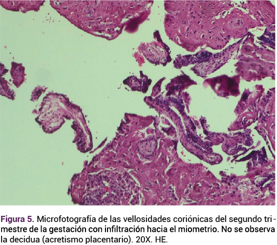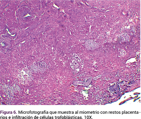 La histerectomía finalizó sin complicaciones inmediatas, con un sangrado estimado de 400 mL y un tiempo quirúrgico de 100 minutos. La pieza quirúrgica se envió a patología (Figura 4), que reiteró el diagnóstico y los hallazgos histopatológicos relacionados con el espectro de acretismo placentario (Figuras 5 y 6). Posterior a la histerectomía la paciente permaneció en observación, con estrecha vigilancia del sangrado. Ante la evolución favorable se le dio el alta del hospital a las 24 horas del posoperatorio.
