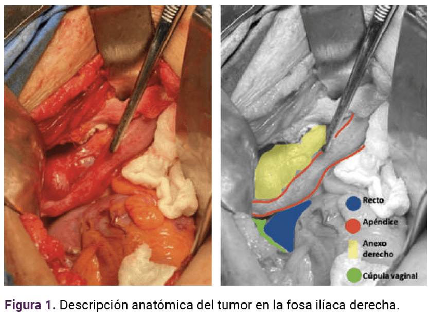 Se programó para tratamiento quirúrgico, mediante laparotomía exploradora, en apoyo con el personal de Cirugía general y de Patología para estudio transoperatorio de ovario. Los principales hallazgos fueron: complejo tumoral en la fosa iliaca derecha, con apendicitis fase 3, que envolvía el ovario ipsilateral y cuya parte distal se encontró adherida a la cúpula vaginal, conformando una fístula apéndico-vaginal. El ovario tenía un quiste de aspecto simple.