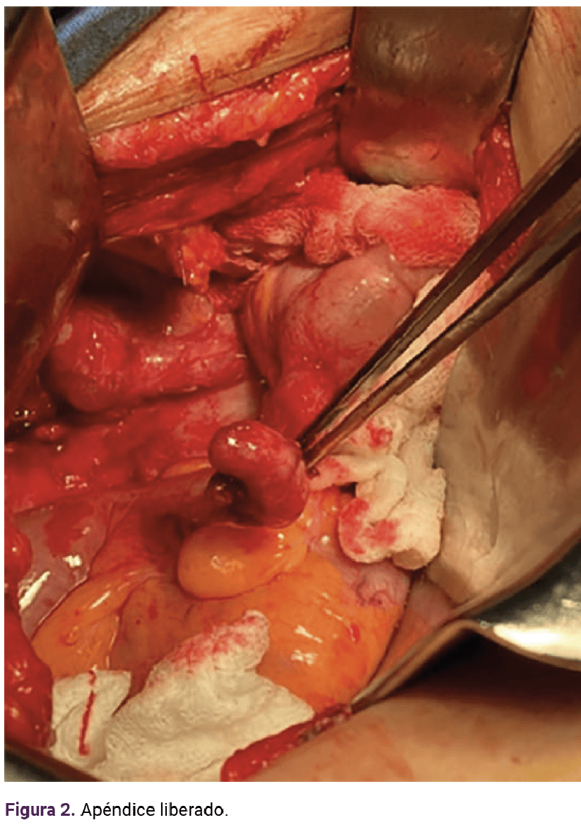 Se resecó el apéndice del proceso fistuloso y del ovario hasta completar la apendicectomía. También se practicó resección del anexo derecho (adjunto al quiste), fistulectomía y reparación de la cúpula vaginal. Figuras 1 y 2