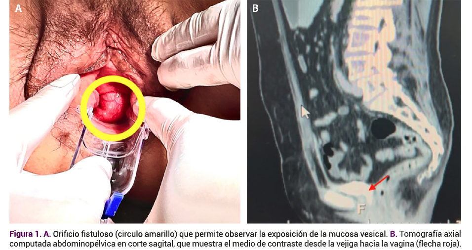 La cistoscopia confirmó la localización del orificio fistuloso a 5 mm de la barra interureteral, además de evidenciar la adecuada coaptación de los meatos ureterales, lo que descartó que se tratara de una fístula ureterovaginal. Además, la TAC con contraste en plano sagital evidenció el paso del medio de contraste desde la vejiga hacia la vagina, con lo que se confirmó la fístula (Figura 1B).