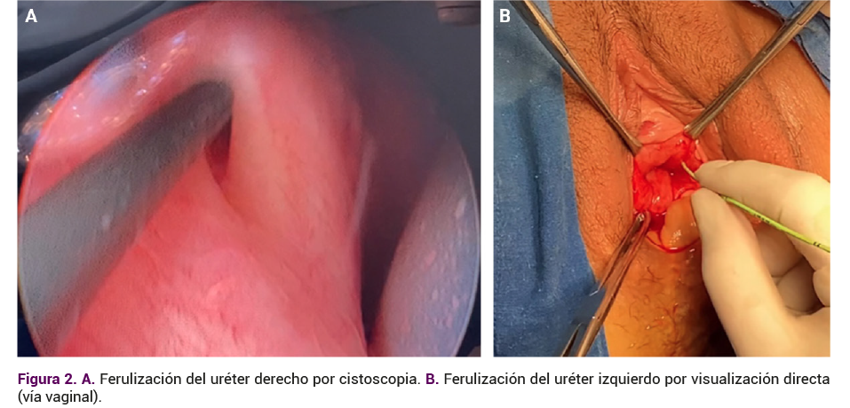 Con anestesia regional y en posición de litotomía se colocó una sonda Foley en el orificio fistuloso para su oclusión. Luego, se procedió a la ferulización del uréter derecho mediante un catéter doble J de 6Fr guiado por cistoscopia y la ferulización directa del uréter izquierdo a través del acceso vaginal valiéndose, igualmente, de un catéter doble J de 6Fr.