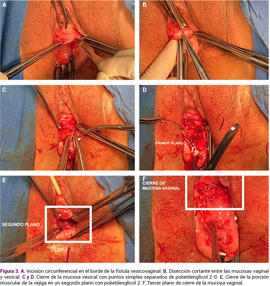 La elección de la vía de acceso es decisiva para el éxito posquirúrgico. En la revisión de la bibliografía se destaca que el acceso vaginal permite una exposición adecuada del campo quirúrgico, favorece una disección precisa de los tejidos y hace posible el cumplimiento de los principios básicos de una reparación exitosa: identificación y exposición del espacio que recorre la fístula, cierre en múltiples capas sin tensión y con tejido debidamente vascularizado.9 La decisión entre el acceso abdominal, vaginal o laparoscópico debe fundamentarse en la experiencia del cirujano, la localización y tamaño de la fístula, así como en los antecedentes quirúrgicos de la paciente.