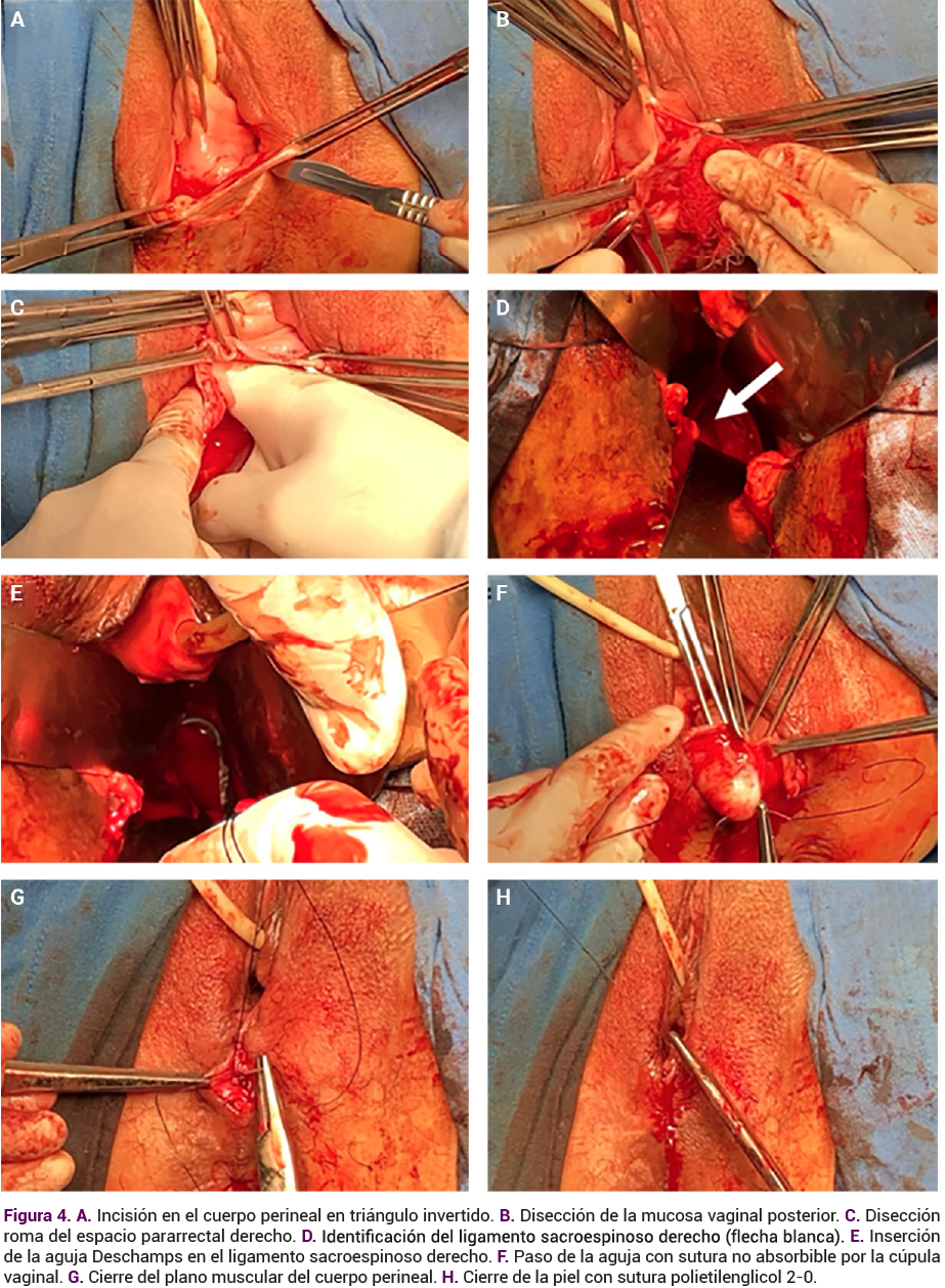 A continuación, la fijación de la cúpula vaginal al ligamento sacroespinoso derecho se hizo con una sutura no absorbible 1-0 (polipropileno), con aguja Deschamps, seguida de perineoplastia para completar el procedimiento reconstructivo.