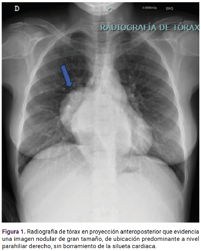 Por lo anterior se solicitó una interconsulta con los cirujanos de tórax quienes, al revisar las imágenes y con el diagnóstico clínico de la paciente, consideraron que eran sugerentes de hematopoyesis extramedular; insistieron en que debía hacerse la toma de biopsia por el alto riesgo de sangrado.