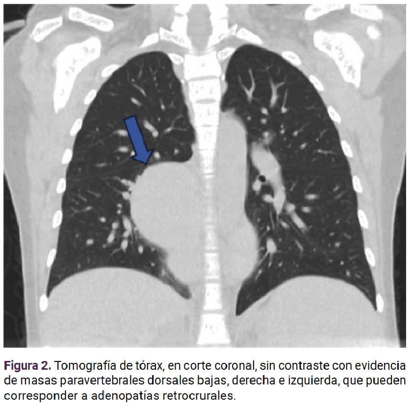 En otra radiografía de tórax se documentó una imagen nodular parahiliar derecha sin borramiento de la silueta cardiaca (Figura 1). Se solicitó una TAC de alta resolución que reportó: masas paravertebrales dorsales bajas a derecha e izquierda quizá correspondientes a adenopatías retrocrurales y nódulo calcificado, en la base del lóbulo superior derecho. Figura 2