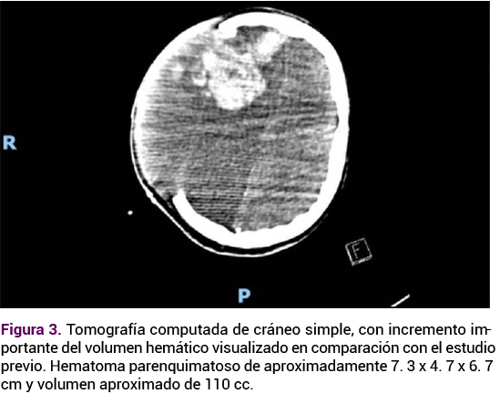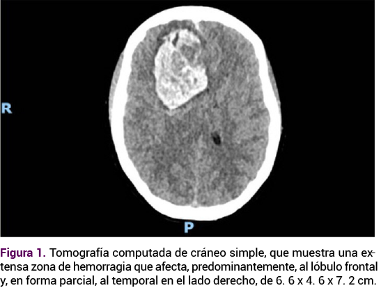 Paciente de 39 años, con antecedentes de artritis reumatoide en remisión, dos embarazos y una cesárea, en curso de las 14.1 semanas de la gestación actual, establecidas con base en la fecha de la última menstruación. Acudió a urgencias debido a un cuadro de cefalea pulsátil 10/10 según la escala verbal numérica, de inicio súbito, de 30 minutos de evolución, acompañada de náusea y vómito de contenido gástrico. Posterior a su ingreso tuvo pérdida de la conciencia y crisis convulsivas, con estado epiléptico, que ameritaron maniobras avanzadas en la vía aérea. La exploración física se valoró con la escala de coma de Glasgow 5 (O:1, V:1, M:3), pupilas anisocóricas a expensas de midriasis derecha de 5 mm e izquierda de 2 mm, abdomen globoso a expensas del embarazo. La TAC simple de cráneo reportó una extensa zona de hemorragia frontotemporal derecha, con edema periférico que provocaba el desplazamiento por efecto de masa de la cisura interhemisférica y compresión del sistema ventricular supratentorial. Luego de la interconsulta con el neurocirujano, neurólogo y obstetra se procedió a la craniectomía descompresiva, drenaje del hematoma subdural e intracerebral y la plastia dural.