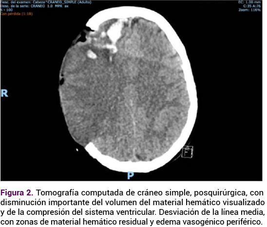 Se indicaron 200 mg de progesterona intravaginal cada 24 horas, vigilancia con toalla testigo y ultrasonido obstétrico de control. En la TAC de control posquirúrgico se apreció mejoría, con disminución del volumen del material hemático visualizado. Se indicaron: vigilancia neurológica y diuresis, antibiótico profiláctico y tromboprofilaxis con vendas de compresión neumática intermitente.