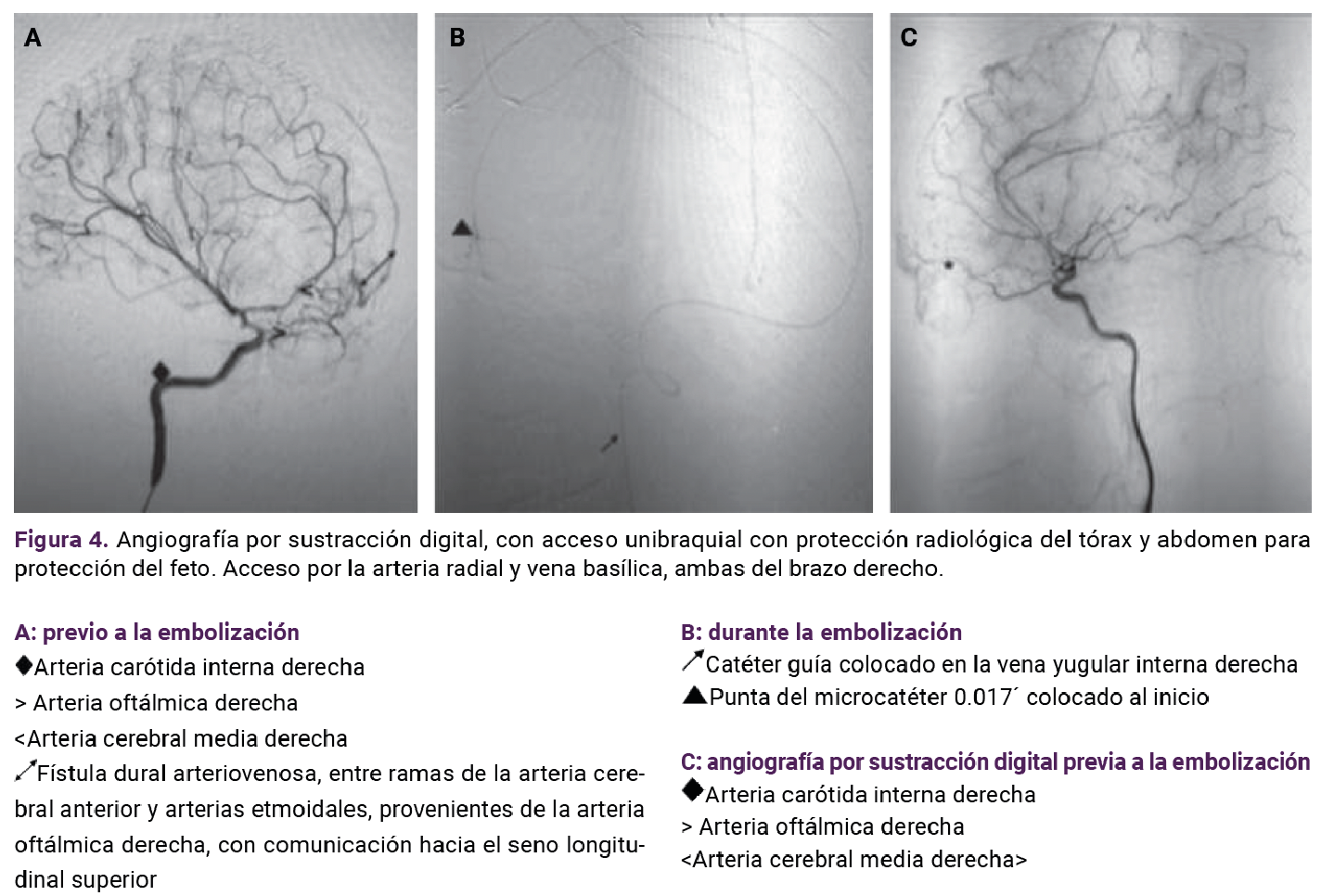 En el sexto día de hospitalización se practicó el cateterismo cerebral en el que se observó una fístula dural arteriovenosa, con afluentes dependientes de los ramos durales, etmoidales anteriores y posteriores, oftálmica y arterias frontales dependientes de la arteria cerebral anterior. Se efectuaron múltiples disparos y, posteriormente, se evidenció el flujo de alta velocidad al seno longitudinal superior. Se colocó un catéter y procedió a la angioembolización de la fístula con onyx. En la angiografía no se observaron residuos, por lo que se hicieron múltiples disparos, con tiempos arteriales y venosos sin afectación, fase capilar con evidencia de daño difuso de la microcirculación cerebral secundaria a los sangrados previos. Se verificó el flujo de ambas arterias carótidas internas cerebrales anteriores y medias. Se indicaron 8 mg de dexametasona cada 12 horas durante dos días. Se continuó la administración de progesterona intramuscular e intravaginal en las dosis mencionadas y vigilancia del sangrado trasvaginal.