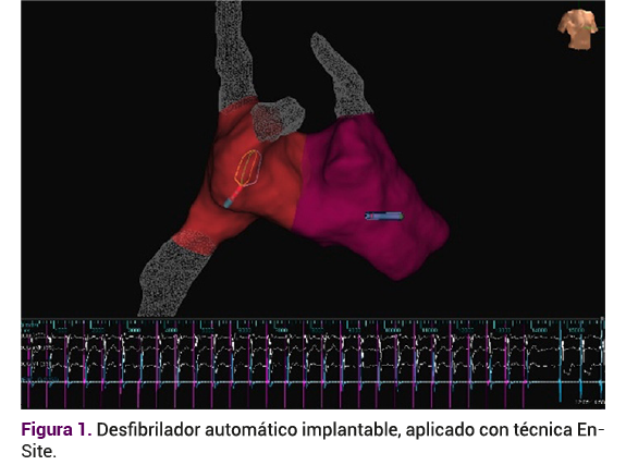 Debido a los diagnósticos de base se llevó a cabo una sesión colegiada con los especialistas de los servicios de obstetricia, terapia intensiva, cardiología y anestesiología, quienes sugirieron la interrupción del embarazo debido al alto riesgo de muerte; sin embargo, la paciente no aceptó esta opción. El cardiólogo ofreció la opción de colocarle un desfibrilador automático implantable (VVI Medtronic™) mediante la técnica EnSite para evitar la fluoroscopia. Se colocó con éxito, sin necesidad de radiación y sin complicaciones. Figura 1