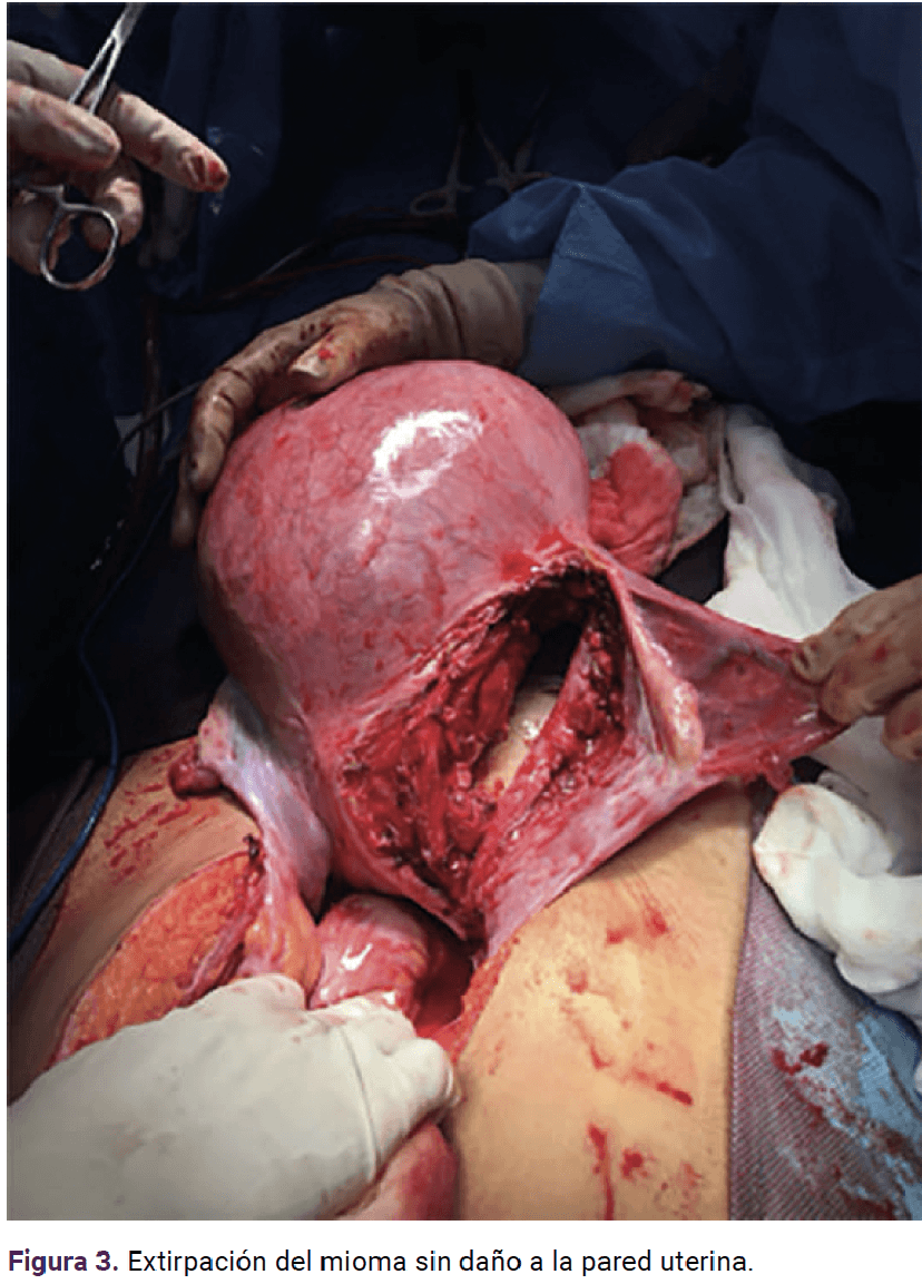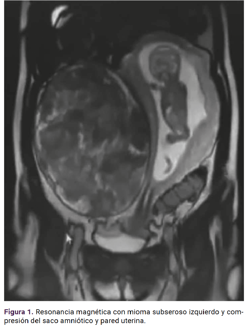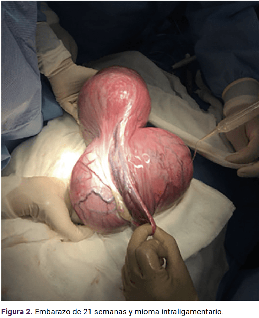 Clinical case: 19-year-old female patient with single myoma complicated by pain despite medical treatment. At 21 weeks she required myomectomy of an intra-ligamentary myoma measuring 20 x 18 x 11 cm and 2410 g. The evolution was satisfactory, she reached 38 weeks and due to the category II registry a cesarean section was decided, obtaining a neonate of 2515 g, Apgar 8-9, with satisfactory evolution.