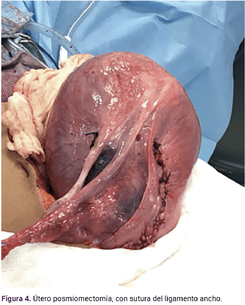Caso clínico: Paciente de 19 años, con mioma único, complicado con dolor a pesar del tratamiento médico. A las 21 semanas requirió la miomectomía, de un mioma intra-ligamentario de 20 x 18 x 11 cm y 2410 g. La evolución fue satisfactoria, llegó a las 38 semanas y por registro categoría II se decidió la cesárea, con obtención de un neonato de 2515 g, Apgar 8-9, con evolución satisfactoria.