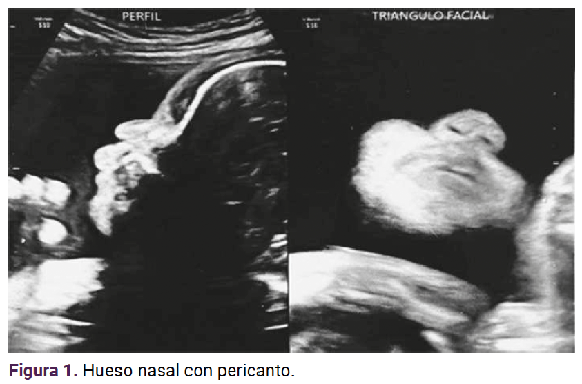 En la ecografía obstétrica de ingreso se encontró un feto vivo en presentación pélvica, con linfedema generalizado, ventrículo de 12 mm, hueso nasal con pericanto (Figura 1),