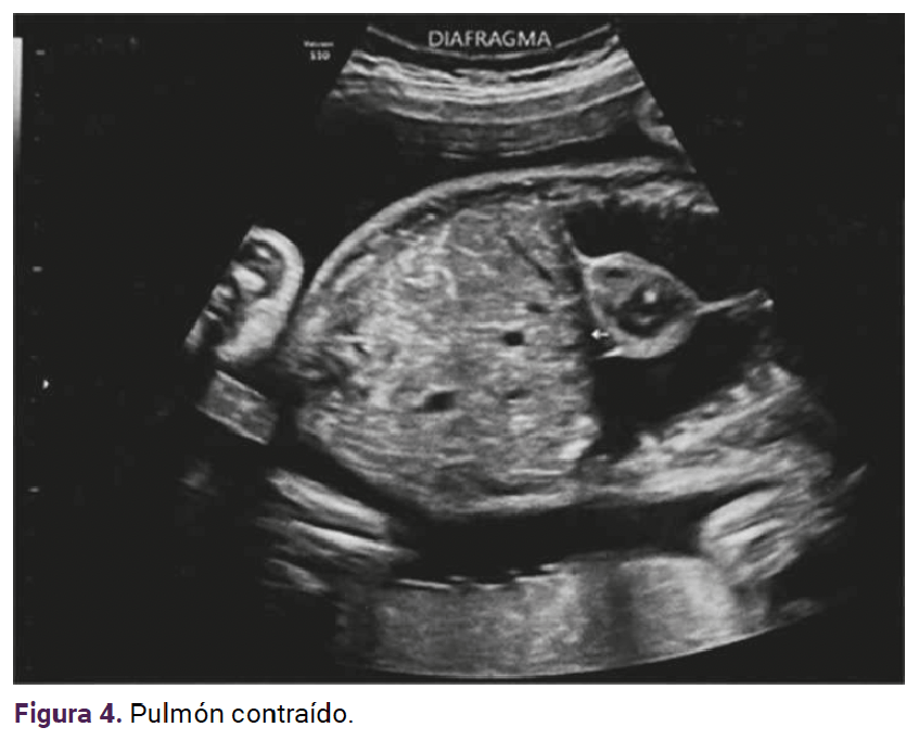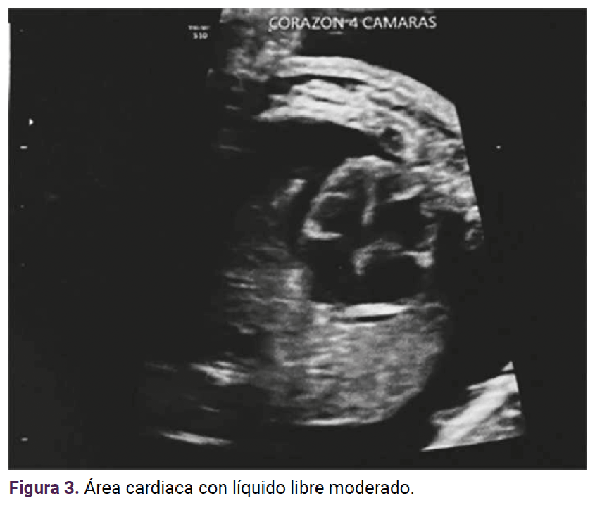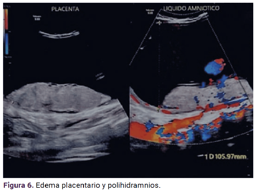 Los demás órganos intraabdominales, como el hígado, estómago y vejiga, mostraron una distribución y ecogenicidad normal. La placenta de inserción corporal posterior grado l de maduración por escala de Grannum, con edema placentario y polihidramnios con columna vertical máxima de 10.5 cm (Figura 6).