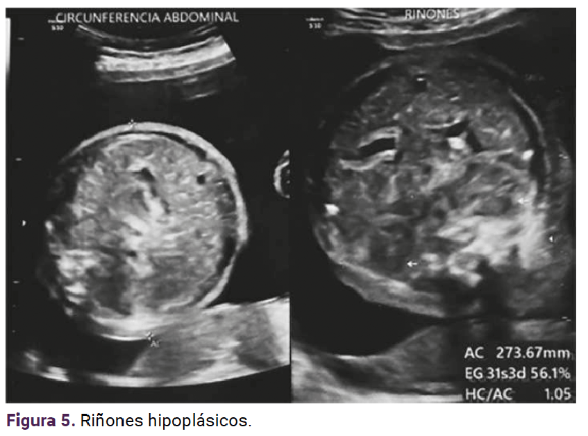 El pulmón se visualizó contraído (Figura 4) y los riñones hipoplásicos (Figura 5).