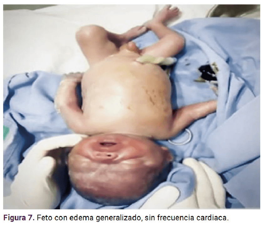 Además, disminución de la diuresis y deterioro de la función renal; por eso se inició el tratamiento antiedema y la finalización del embarazo por parto. Se llevó a cabo la conducción del trabajo de parto que evolucionó de forma favorable, con neonato sin frecuencia cardiaca, con datos de edema generalizado y alteraciones faciales (Figura 7).