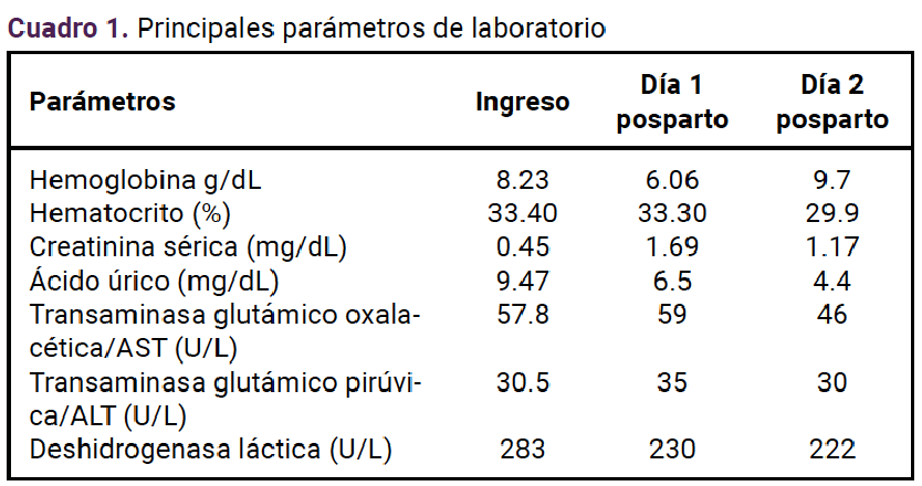Durante la vigilancia posparto se detectó el aumento del recuento plaquetario, con disminución significativa de transaminasas y creatinina, con menor dificultad respiratoria, sin datos de sobrecarga o edema, con adecuado control de cifras tensionales con el calcioantagonista. Al tercer día de posparto se dio de alta del hospital, sin complicaciones.