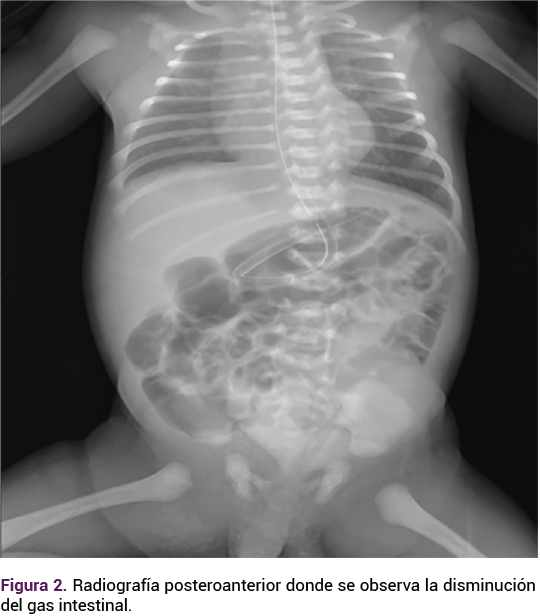 El embarazo finalizó mediante parto espóntaneo con un recién nacido de término, masculino, de 37 semanas por Capurro, placenta y membranas completas, con líquido amniótico de características normales, sin meconio, con talla de 50 cm, peso de 3300 g, Apgar 8-9 con permeabilidad nasal, ano y esófago, a la palpación abdominal con una tumoración de aproximadamente 7 x 5 cm fija, de consistencia dura, peristalsis normal, con el testículo izquierdo en la bolsa escrotal. A la palpación se evidenció la ausencia del testículo derecho en la bolsa escrotal. En la radiografía posteroanterior se observó la disminución del gas intestinal. Figura 3.