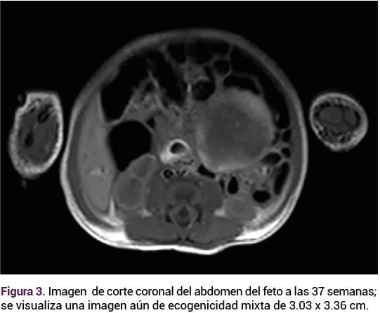 Ante las características ecográficas de la tumoración se decidió la conducta expectante, con seguimiento ecográfico. A las 37 semanas el feto continuaba con una frecuencia cardiaca de 140 lpm, peso de 3186 g, percentil 84, placenta fúndica, líquido amniótico cualitativamente normal. Sin embargo, con un aumento notable del tamaño de la tumoración intraabdominal, ahora 1 cm más grande, respecto del rastreo previo.
