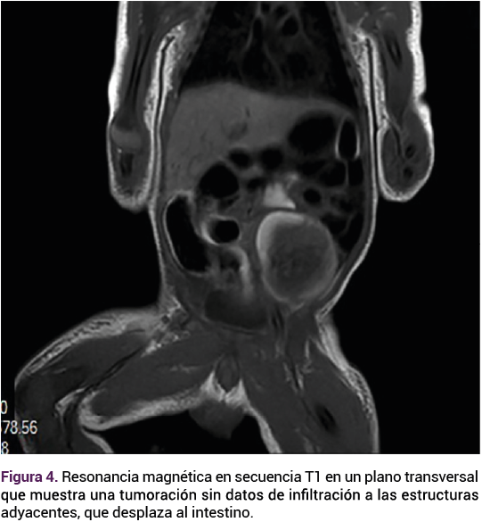 Durante su estancia en la unidad de cuidados neonatales se practicó una resonancia magnética que evidenció la tumoración, sin datos de infiltración a las estructuras adyacentes, que desplaza al intestino. Figura 4.