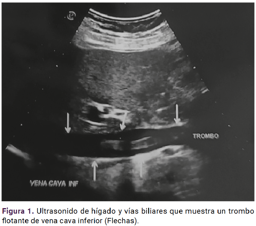 Ante el cuadro clínico, se indicó un ultrasonido abdominal para descartar afecciones de diagnóstico diferencial, como la apendicitis, sin encontrar evidencia de ésta. Los análisis de laboratorio reportaron: hiperbilirrubinemia a expensas de bilirrubina indirecta (BT 3.1 mg/dL, BI 2.5 mg dL), sin datos de hemolisis asociados y un aumento en los reactantes de fase aguda, como la PCR (26 mg/dL) y μL leucocitosis de 18.3 y neutrófilos de 85%. Por lo tanto, se solicitó un ultrasonido de hígado y vías biliares que reportó la existencia de un trombo flotante en la vena cava inferior. Figura 1
