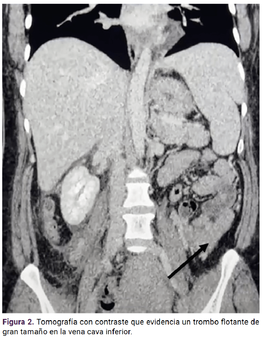 Caso clínico: Paciente femenina de 35 años, con antecedente de tres embarazos: dos partos y un aborto, en el transcurso del segundo día de puerperio; quien acudió a consulta médica por fiebre no cuantificada, dolor abdominal difuso en el hipogastrio principalmente en la fosa iliaca derecha que se irradia a la región inguinal, escalofríos, diaforesis y sangrado transvaginal moderado. En el estudio de imagen se encontró un trombo flotante en la vena cava inferior. Se inició tratamiento con heparina de bajo peso molecular (HBPM) y se envió a un hospital de a tercer nivel.