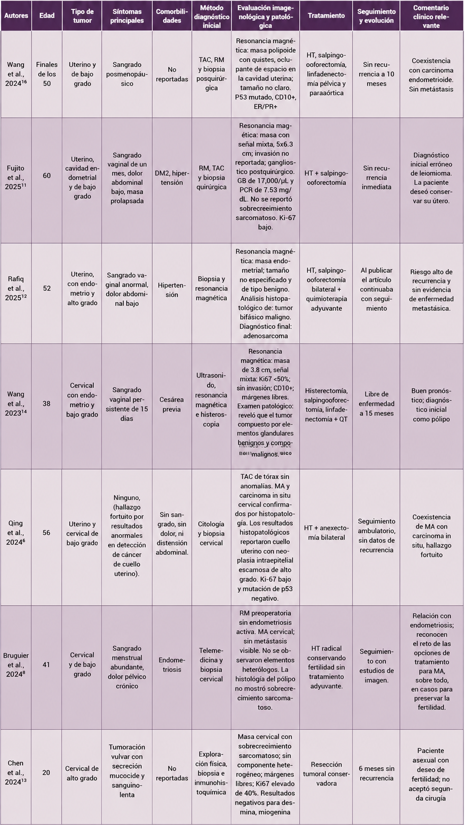 Se emprendió una búsqueda en PubMed, Google Académico y Scielo con las palabras clave: “Mullerian adenosarcoma AND case report” de artículos publicados en los últimos 10 años, escritos en inglés o español. De 6964 artículos identificados se seleccionaron 7 por ser los que reportaron mayor evidencia clínica comprobable y ser los más actuales. Una vez identificados se construyó una matriz comparativa. Cuadro 1