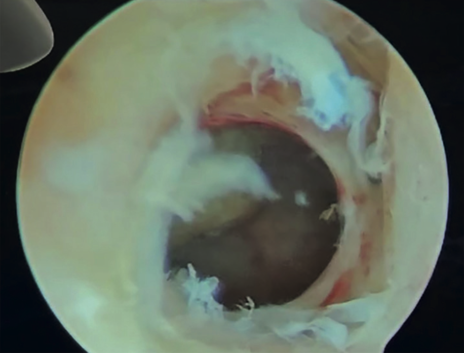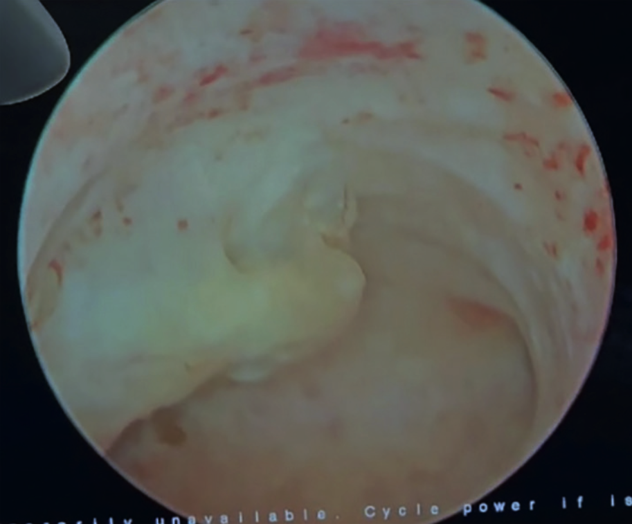 La resonancia magnética de pelvis, con gadolinio, reportó una lesión ocupante de espacio en la cavidad endometrial, con probable etiología maligna, sin crecimientos ganglionares. La tomografía axial computada de tórax simple con dos nódulos pulmonares de carácter indeterminado a nivel del segmento apicoposterior, con diámetros promedio de 4 mm: un nódulo lingular de 2 mm, y un nódulo segmentario apical del lóbulo superior derecho de 3 mm. Como parte del protocolo de estudio se programó para una histeroscopia diagnóstica con nueva toma de muestra de tejido endometrial, en la que se observó un pólipo endometrial con endometrio atrófico (Figura 1), orificio cervical externo con evidencia de una lesión polipoide, orientada hacia el fondo uterino. Figura 2