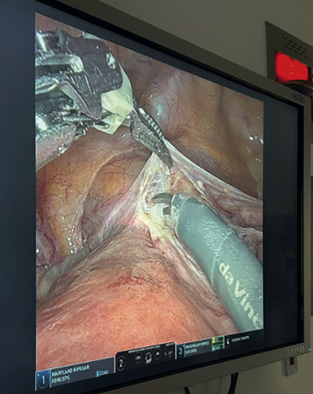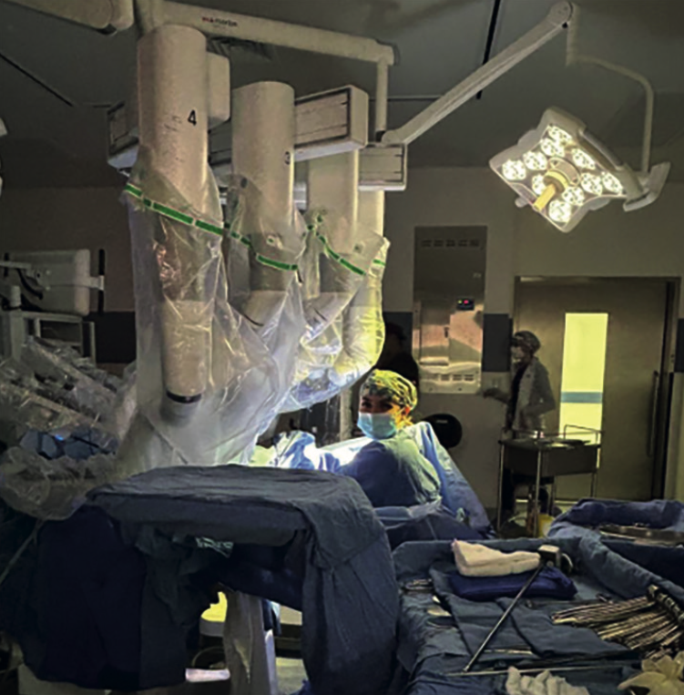 CASO CLÍNICO: Paciente de 68 años, con síntomas de sangrado transvaginal moderado, de dos meses de evolución, con astenia, adinamia, pérdida de peso y diaforesis nocturna. En la biopsia de endometrio y revisión de laminillas se observó una neoplasia maligna, con patrón de crecimiento bifásico. Se indicó la histerectomía total, con salpingooforectomía bilateral, asistida por robot Da Vinci. El reporte de patología fue de adenosarcoma mülleriano de alto grado, sin sobrecrecimiento sarcomatoide, Ki-67 de 55%, sin p53 mutado. No reportó complicaciones ni requirió reintervención.