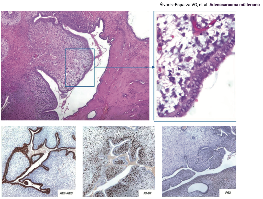 CONCLUSIÓN: Si bien el adenosarcoma mülleriano es poco frecuente, el de alto grado poco se ha estudiado. Al comparar el caso aquí comunicado, con los reportados en la bibliografía, se identificaron algunos resultados heterogéneos que se sugiere continuar estudiando; en particular, un Ki-67 alto, la mutación del p53 y el sobrecrecimiento sarcomatoso.