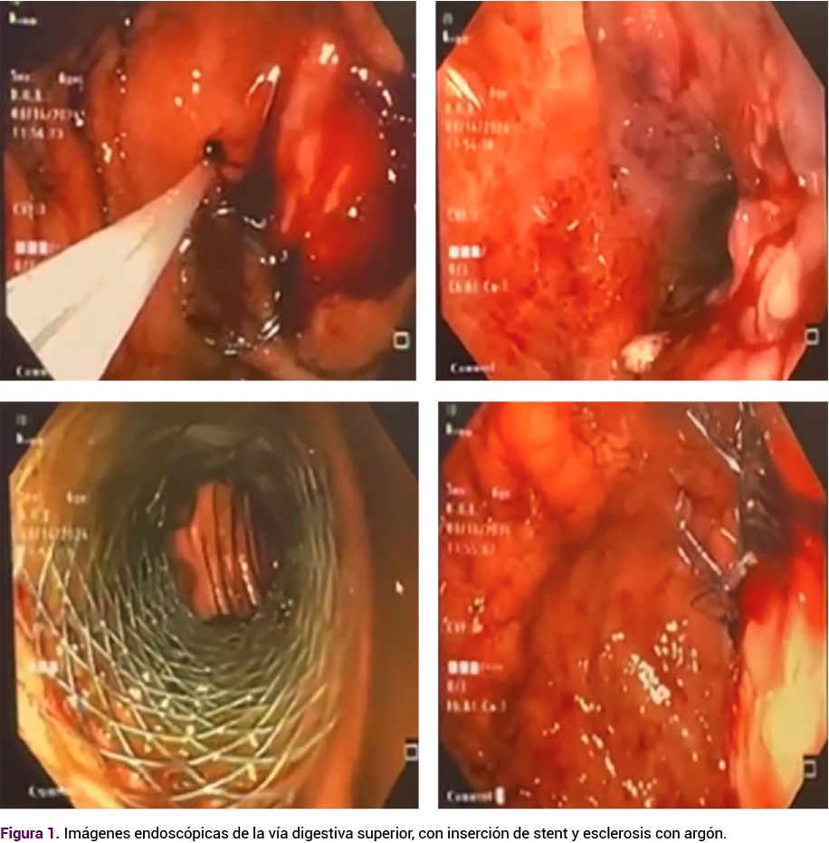 En la endoscopia, a través del stent, se observó una tumoración friable que se introducía al interior de este y no permitía el avance del instrumental al duodeno. Se procedió a la escleroterapia, con adrenalina al 1:20.000 UI y argón plasma para control del sangrado.