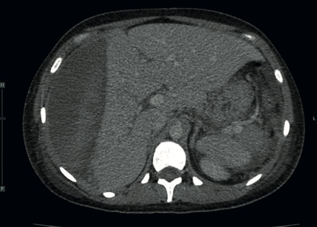 Paciente de 27 años, multigesta (tres embarazos, una cesárea y dos abortos), con antecedente de complicación hemorrágica en la cesárea previa. Ignoró si tenía enfermedades crónico-degenerativas preexistentes, solo reconoció la toxicomanía activa a metanfetaminas (“cristal”). Fue enviada a una unidad de segundo nivel luego de cursar un puerperio quirúrgico inmediato, complicado con eclampsia. El cuadro inició con cefalea intensa, cifras tensionales superiores a 180-110 mmHg y una crisis convulsiva tónico-clónica generalizada. Posterior al evento convulsivo, la paciente tuvo dolor abdominal súbito, de intensidad 10 de 10 en el hipocondrio derecho, seguido de un estado de agitación psicomotriz y posterior estupor. Durante el traslado se documentó hipotensión y un hemoperitoneo clínico con pérdida sanguínea estimada de 700 mL. A su ingreso a la unidad de cuidados intensivos se inició el soporte ventilatorio mecánico invasivo con sedoanalgesia.