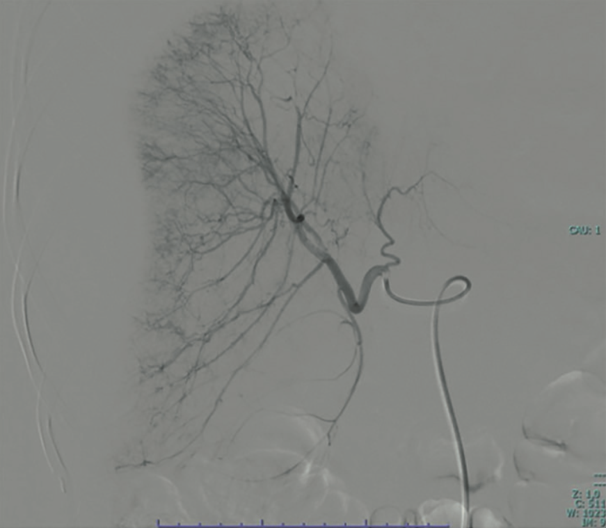 El ultrasonido y la tomografía axial computada confirmaron el hematoma subcapsular hepático que afectaba el 50% de la superficie glandular (Figura 1). La resonancia magnética sugirió un edema cerebral compatible con síndrome de encefalopatía posterior reversible (PRES). Ante el diagnóstico de hematoma hepático subcapsular y el alto riesgo de avance, se procedió a la laparotomía exploradora. Se encontró un hemoperitoneo de 200 mL y un hematoma subcapsular del 50%. Se decidió el empaquetamiento hepático y la colocación de drenajes. De manera complementaria, el radiólogo intervencionista llevó a cabo una embolización selectiva de la arteria hepática común mediante la aplicación de 5 mL de espuma hemostática, vía cateterismo del tronco celiaco (Figura 2). Luego del procedimiento, la paciente evolucionó hacia la estabilidad hemodinámica, con logro de una extubación satisfactoria y alta al servicio de ginecología al día siguiente de la embolización. Al sexto día de estancia hospitalaria la paciente se reportó consciente, orientada y con mejoría sustancial del perfil hepático (AST 420 U/L, ALT 1139 U/L) y recuperación de la función renal.