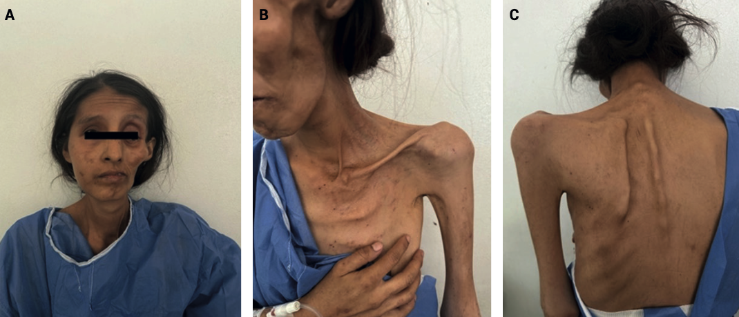 Ingresó al hospital debido a un cuadro de tos, con expectoración y hemoptisis. El cultivo de la expectoración evidenció el crecimiento de Escherichia coli BLEE positivo, con baciloscopia negativa; recibió meropenem durante 10 días. Posteriormente fue trasladada al Hospital General de México para vigilancia y atención en una unidad de tercer nivel. A su ingreso cursaba con 30.6 semanas de embarazo, determinadas por la fecha de la última menstruación, síndrome de Parry Romberg (Figura1), desnutrición aguda y probable hipertensión arterial pulmonar, de acuerdo con el ecocardiograma que reportó una presión sistólica de la arteria pulmonar de 51 mmHg, sin evidencia de insuficiencia cardiaca.